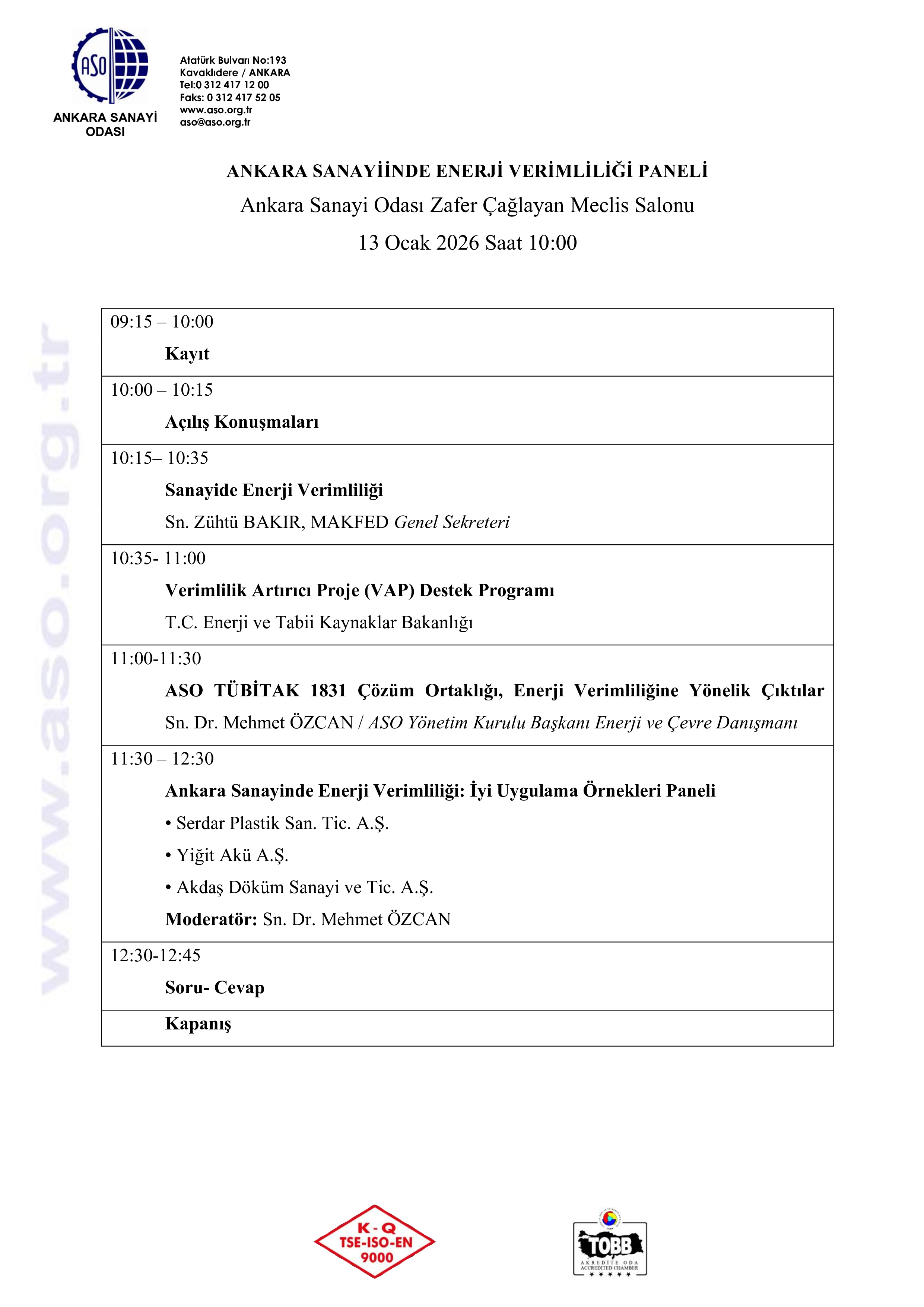 Programı ilişikte yer alan ücretsiz etkinliğe katılım sağlamak isteyen firmalar 12 Ocak 2026 Pazartesi günü Saat:17:00’a kadar https://www.aso.org.tr/form/ankara-sanayiinde-enerji-verimliligi-paneli-348 adresi üzerinden kayıt yaptırabileceklerdir.
